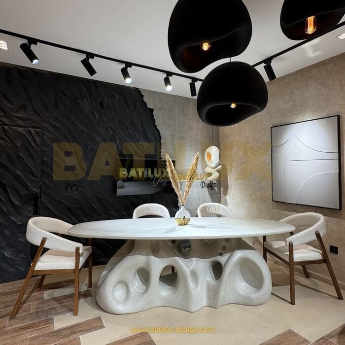 La table VULKA incarne la puissance et la poésie du design organique. Entièrement façonnée à la main en béton ciré, elle évoque les formes naturelles sculptées par le temps — entre matière brute et élégance fluide.